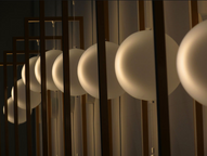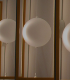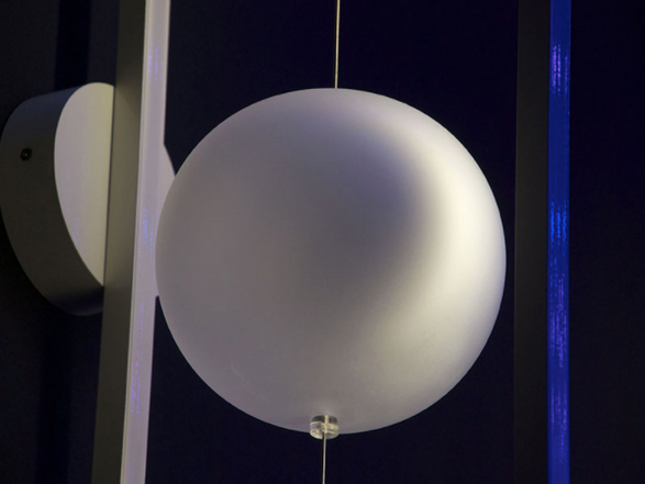 The LED light source inside the painted aluminium frame hits the glass which reflects the light onto the wall. The position of the sphere can vary vertically. The frame can be personalised in the colours: white, red or black.