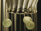 Round ceiling chandelier in fibre glass, hand decorated in gold or silver leaf, or lacquered in requested colours. Different glass shapes and sizes available. 40 cm or 70 cm tassel included.